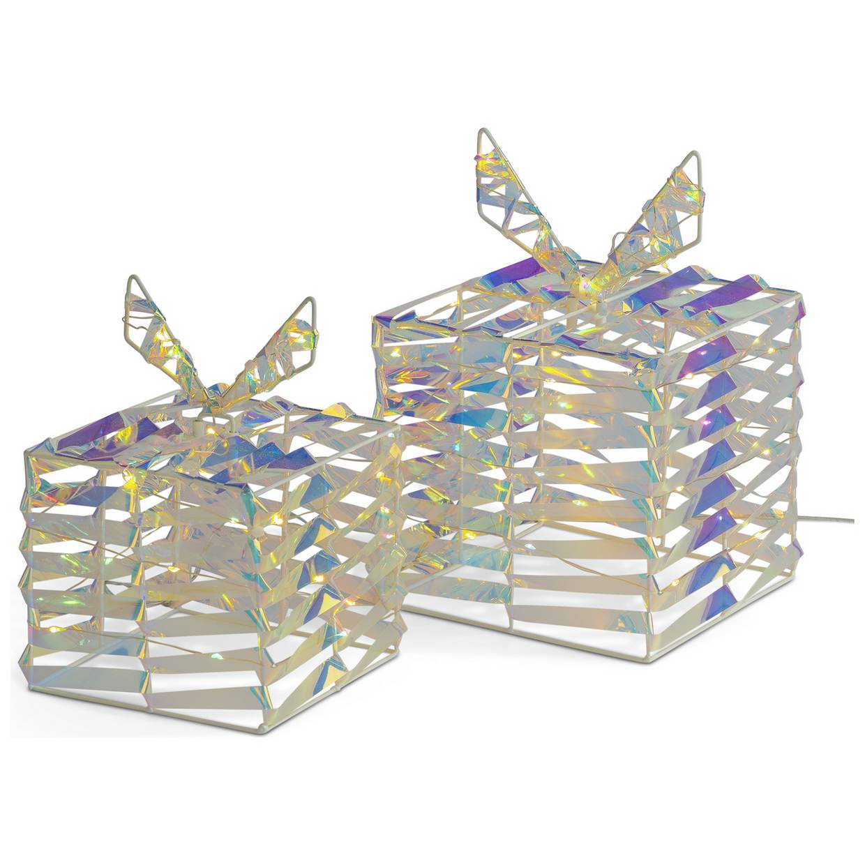 Twinkling lights illuminate the metal and plastic frames that can be used inside or outdoors.