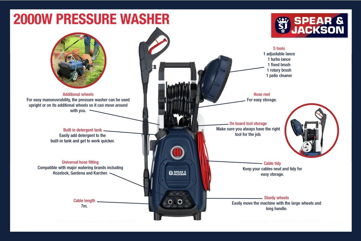 This pressure washer is Spear & Jackson's most powerful model ever, featuring an impressive rated bar of 110.