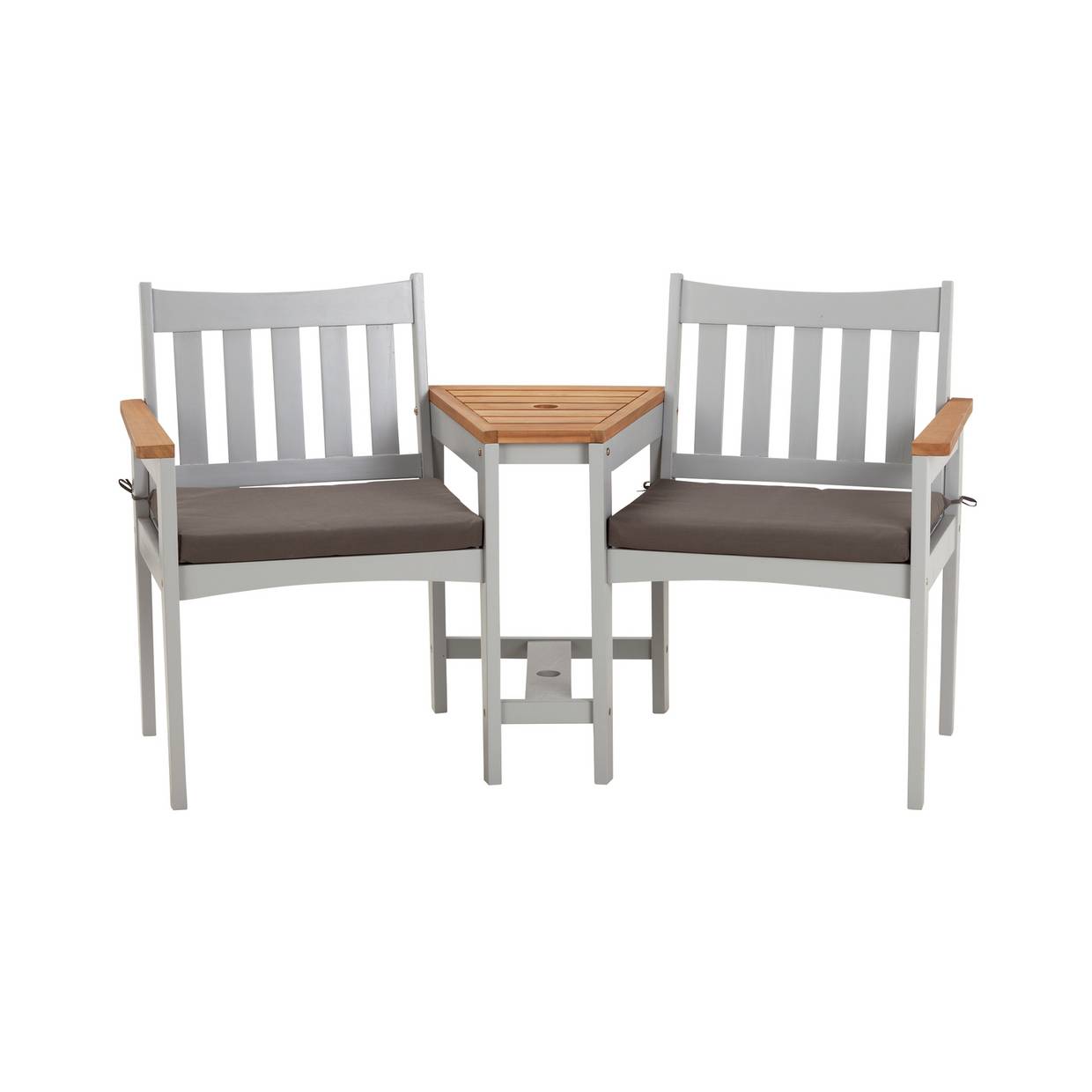 Share the view with a loved one and watch the sunset together! The adjoining table sits snuggly between both chairs and is ideal for popping your cold, refreshing drinks on. It features room for a parasol to be added if desired. In a delightful two-tone grey, we've included cushions to make for a comfy sit.