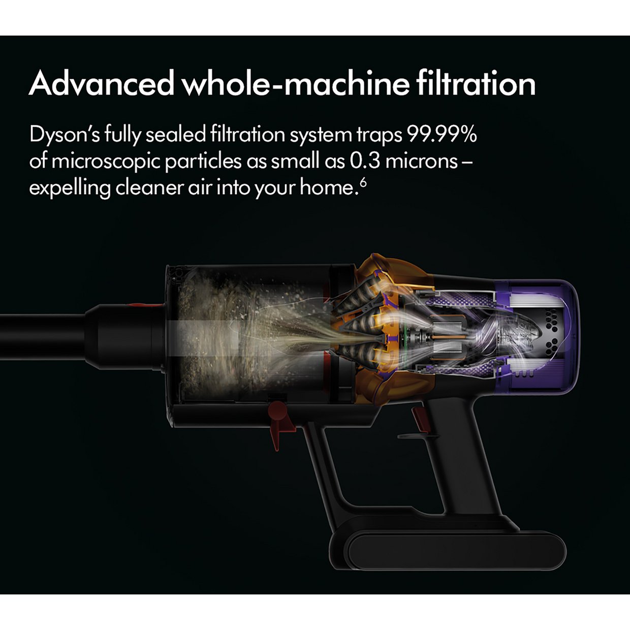 Whole-machine advanced filtration: Dyson's fully-sealed filtration system captures dust and seals in 99.99% of microscopic particles and allergens-expelling cleaner air into your home6.