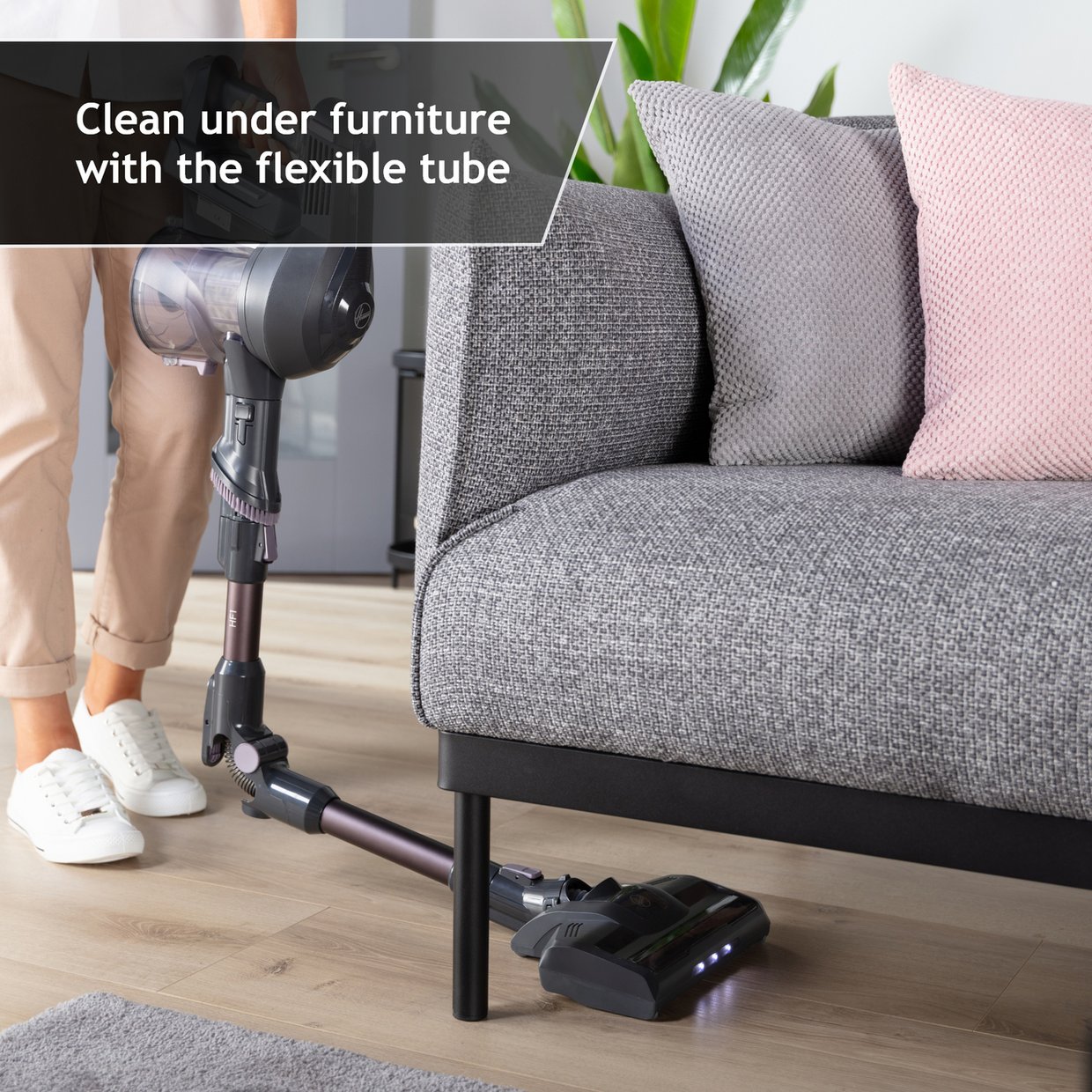 HF1 offers versatile cord-free cleaning with up to 30 minutes of power and a flexible tube to clean under and around low furniture with ease.