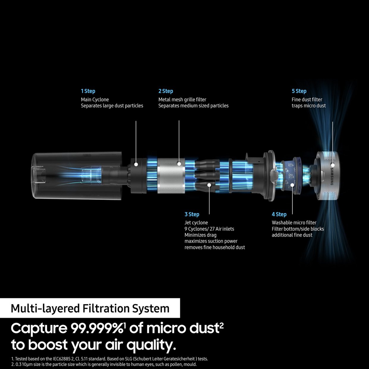 The Multi-layered Filtration System captures up to 99.99% of microdust particles, dust and allergens, making the air in your home as hygienically clean as your floors.