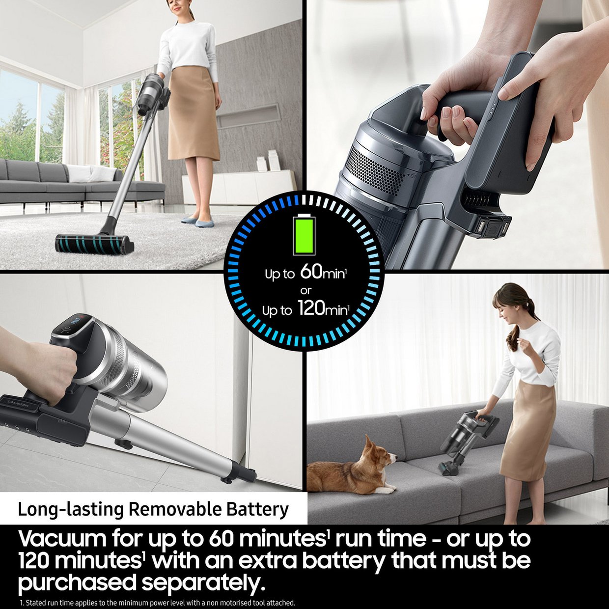 With up to 1 hour run time, there's plenty of power to vacuum the whole house in one go. It's all down to the long-lasting, removable battery.