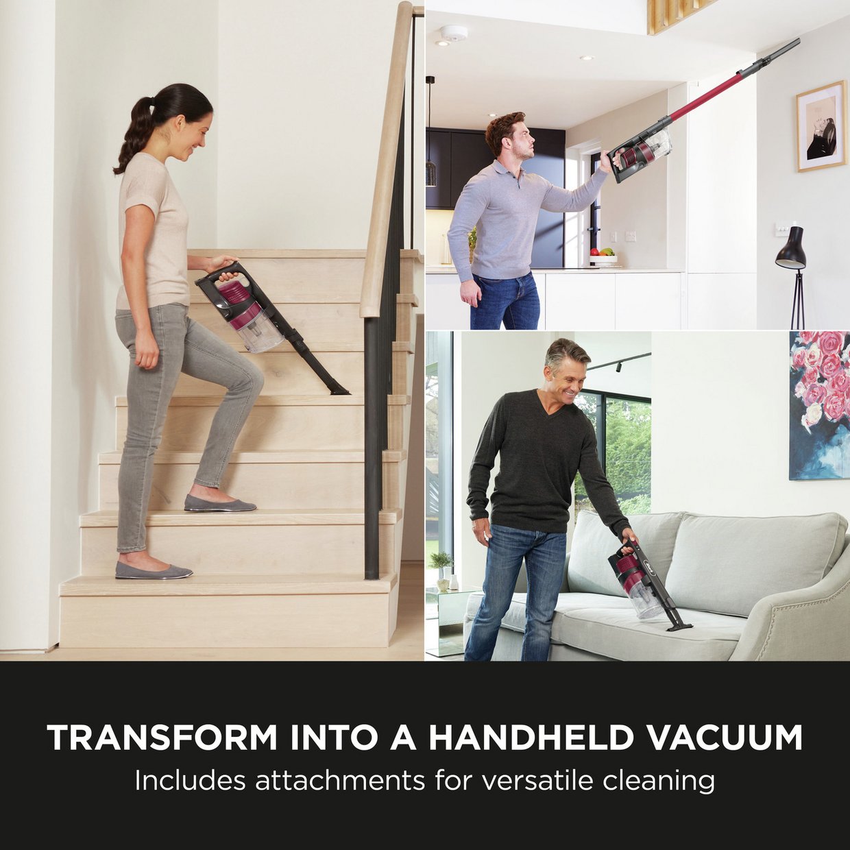Transform into a handheld vacuum: Go handheld to clean surfaces, soft furnishings, stairs, in the car and more with the included Crevice Tool and Upholstery Tool. Extend your reach up high with the wand in handheld mode.