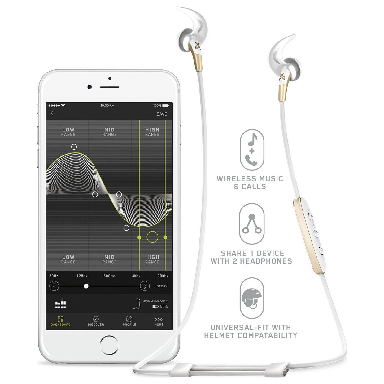 Custom Sound Pump up the bass – FREEDOM 2 works with the Jaybird app, allowing you to alter your sound signature to your preferred sound. Save your new sound profile to your buds, name it, and share it with the Jaybird community.