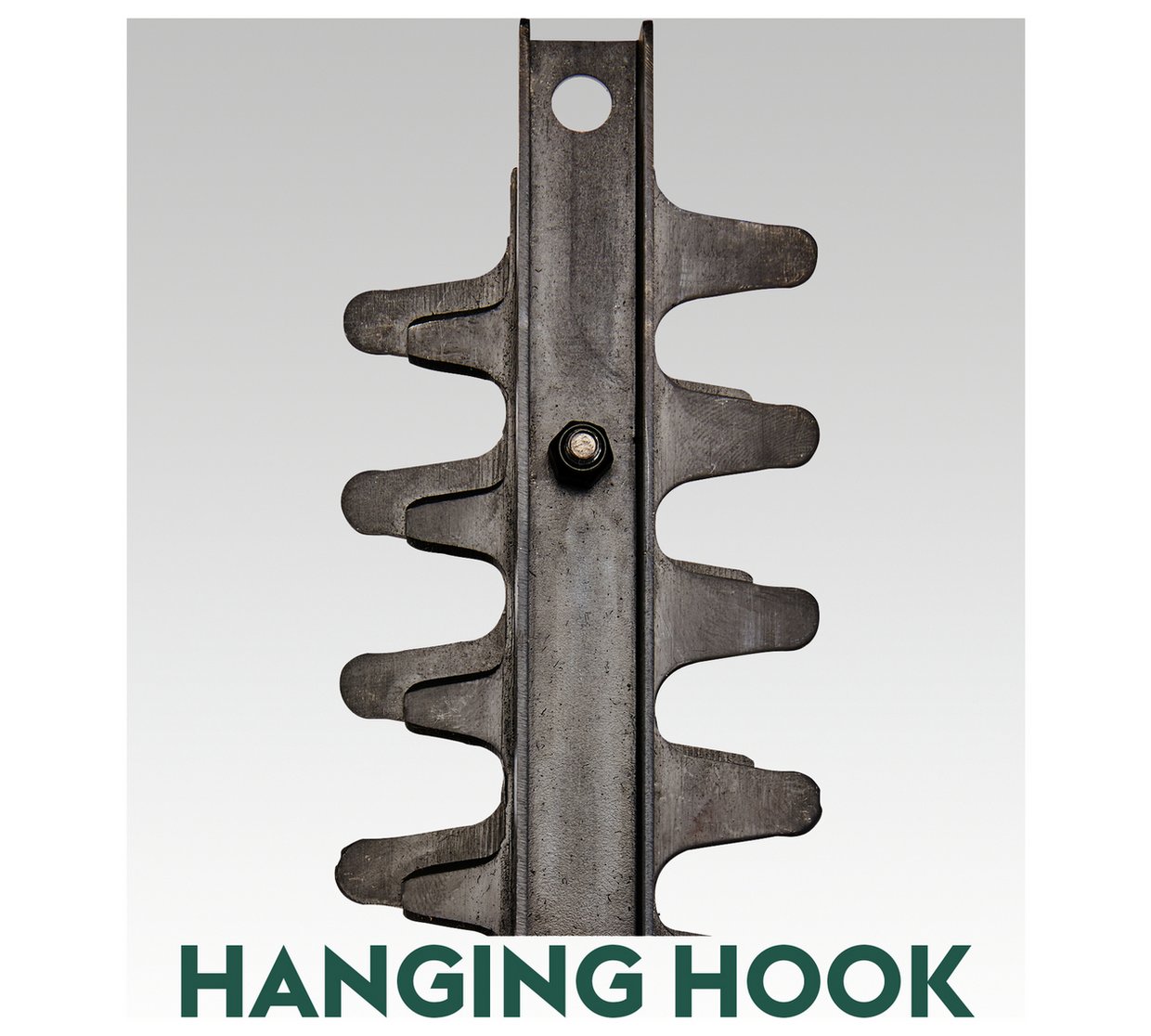 Dual switch prevents accidental operation, and a hanging hook on the blade tip enables easy storage.