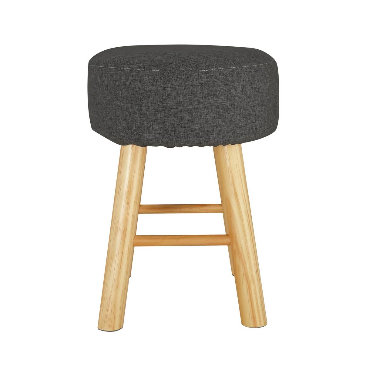 Atop its light wooden base sits an upholstered cushion in charcoal.
