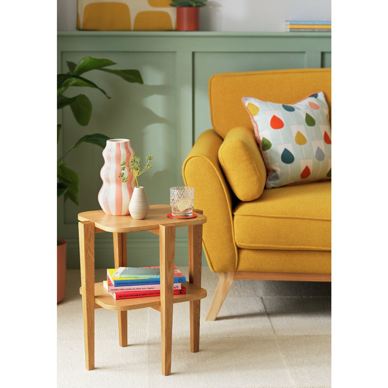 Our natural oak side table features a lozenge shaped top and matching undershelf nestling between long lean legs.