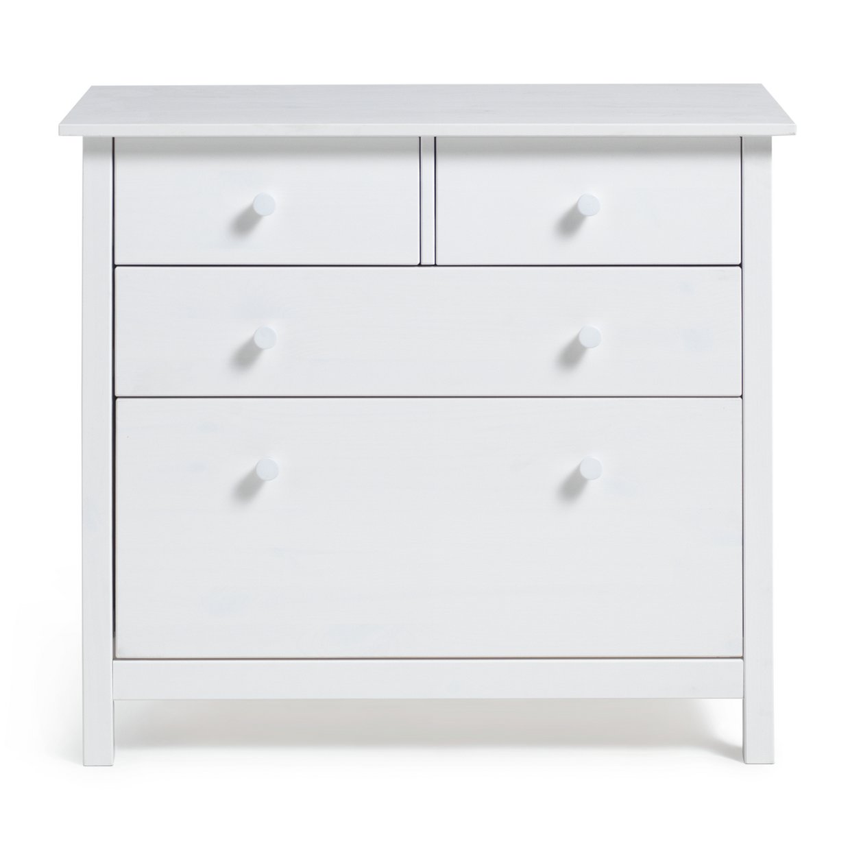 Fitted with easy-glide metal runners, it has 2 narrow drawers for small items, 1 wide drawer for larger items such as clothing and toys, and 1 extra deep bottom drawer for bulkier items. Made from solid wood, it has a whitewash finish for a bright and fresh look, and the woodgrain shows through for a natural feel.