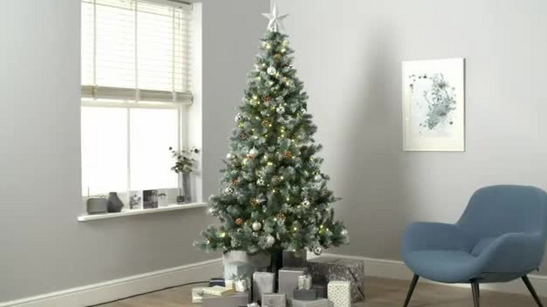 It comes pre-lit with warm white bulbs and complete with pine cone decorations and a dusting of snow.