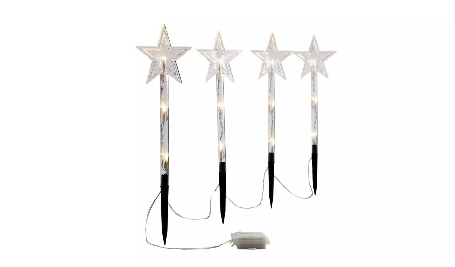 Battery operated with stake bases this pack of 4 contemporary lights can be used along a path or popped into plant pots.