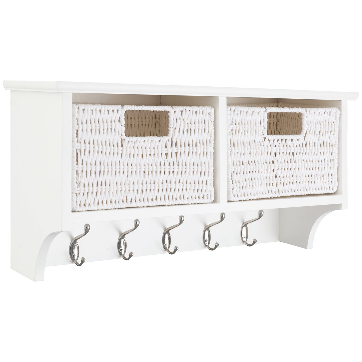 Painted in bright white, this 5 hook coat rail shelf comes with 2 woven baskets.