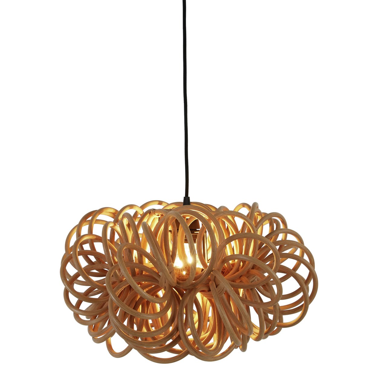 Featuring dozens of intricately woven rattan loops, the shade forms a dynamic, cloud-like silhouette that brings warmth, movement, and personality to any room.