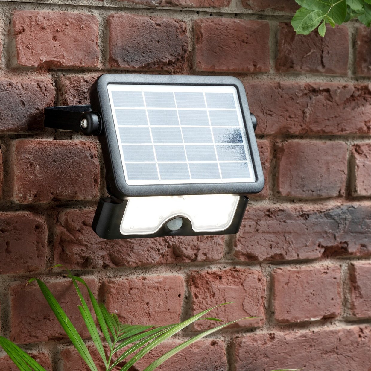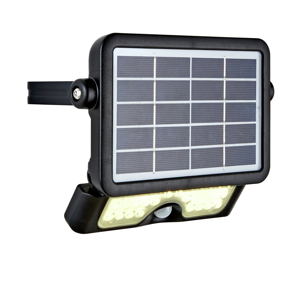Exterior floodlight with solar technology in a black durable polycarbonate body. Perfect for external residential applications with no mains power, no wiring required. It has 3 nights motion sensing illumination (18 hours total).