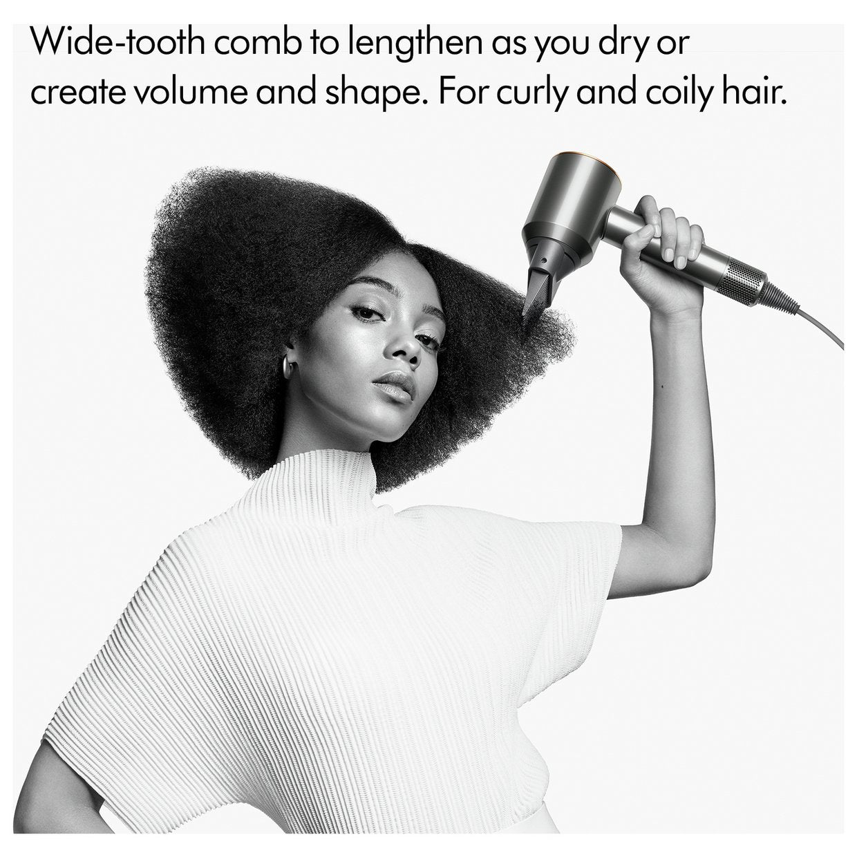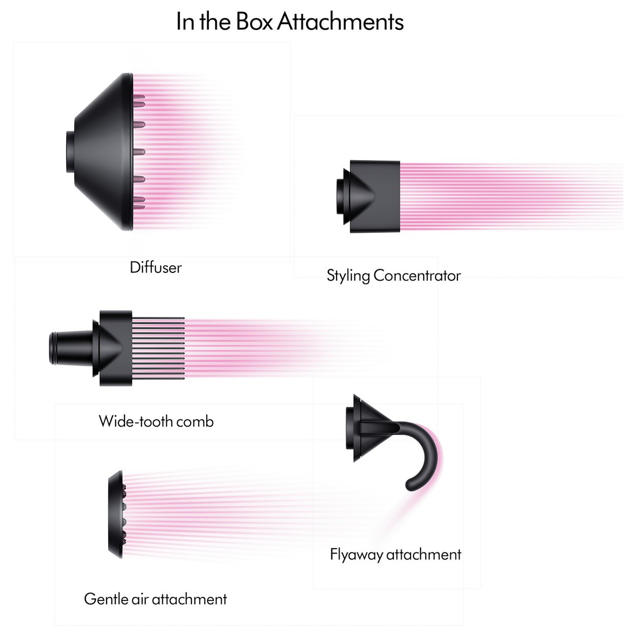 Box contents: Supersonic hairdryer, Flyaway attachment, Styling concentrator, Diffuser, Gentle air attachment, Wide-tooth comb, 1 For use on dry and straight[ened] hair.