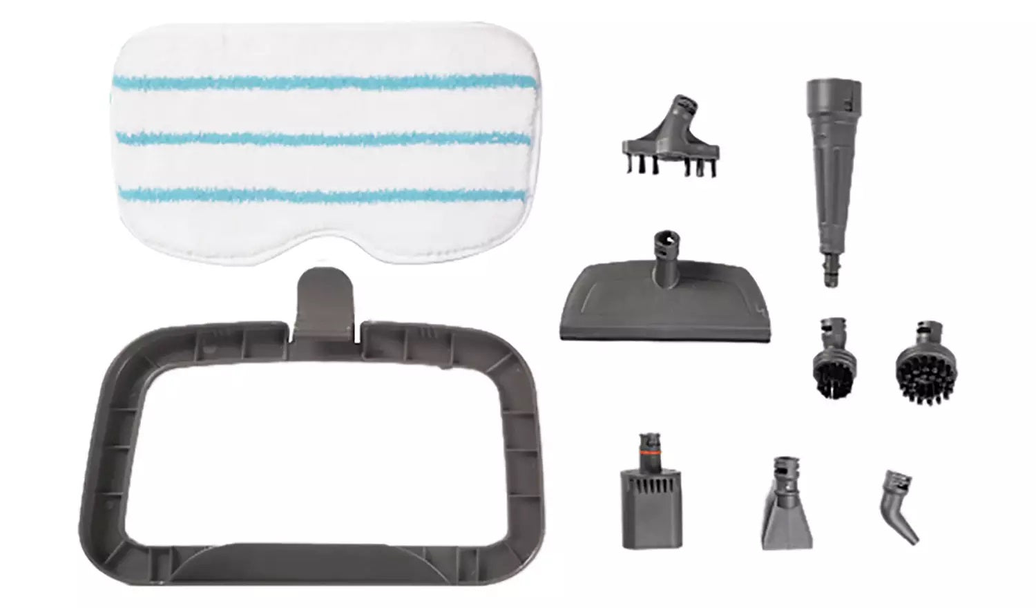 Accessories included: 1 x measuring cup, 1 x window cleaner, 1 x towel cloth,1 x flat brush, 1 x nylon round brush, 1 x shovel nozzle , 1 x cone nozzle,1 x small bend nozzle, 1 x microfiber pad,1 x carpet glider.