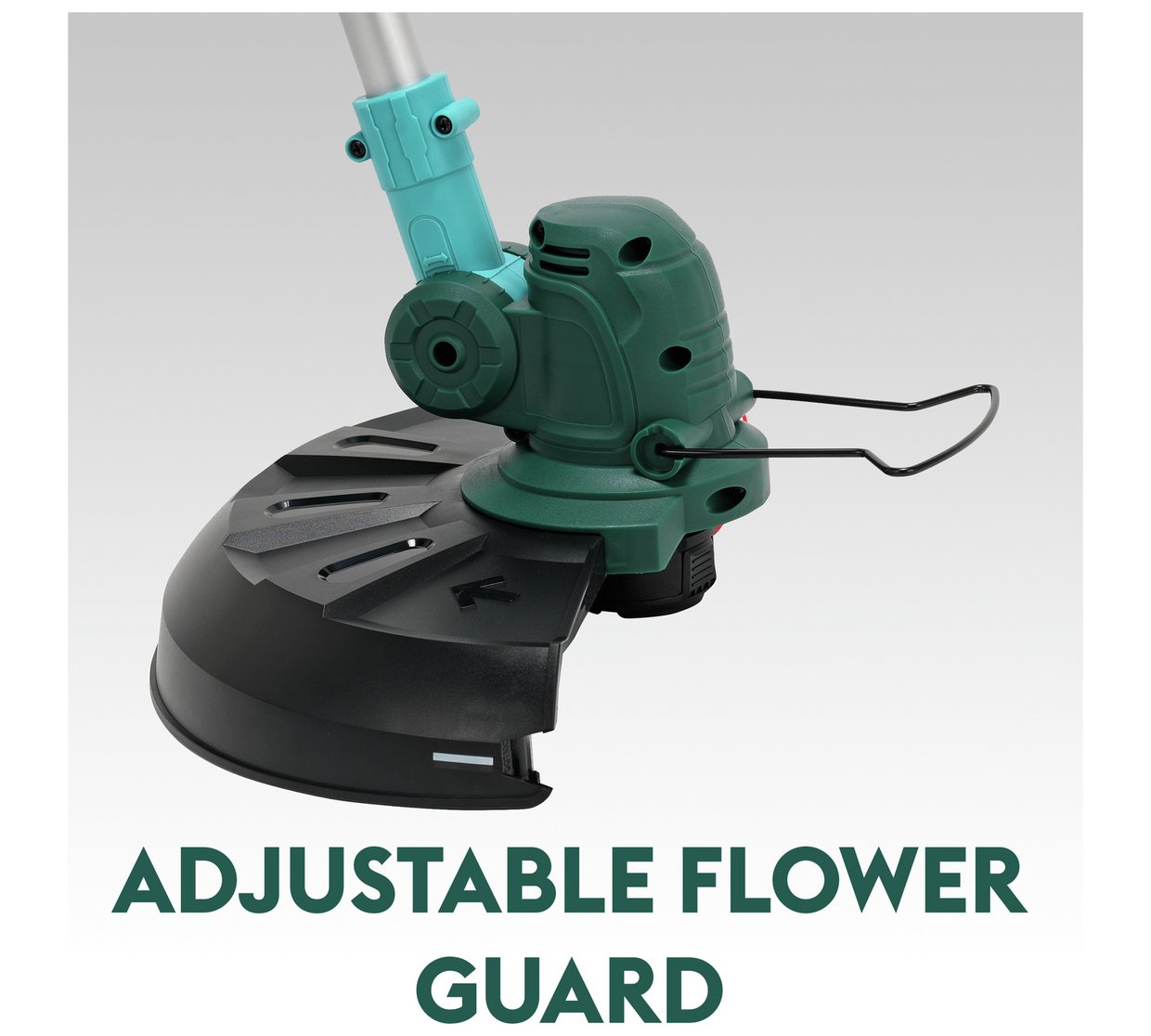 Safety guard and features a plant guard to protect your flowers and plants while trimming the grass.