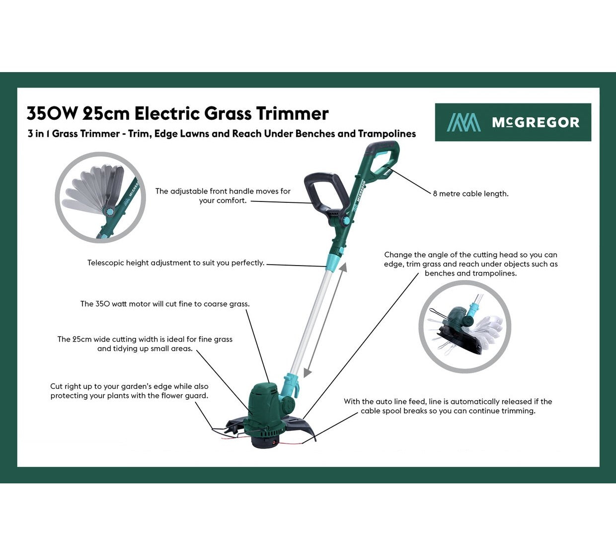 This McGregor 350W 25cm grass trimmer is ideal for cutting fine to coarse grass.