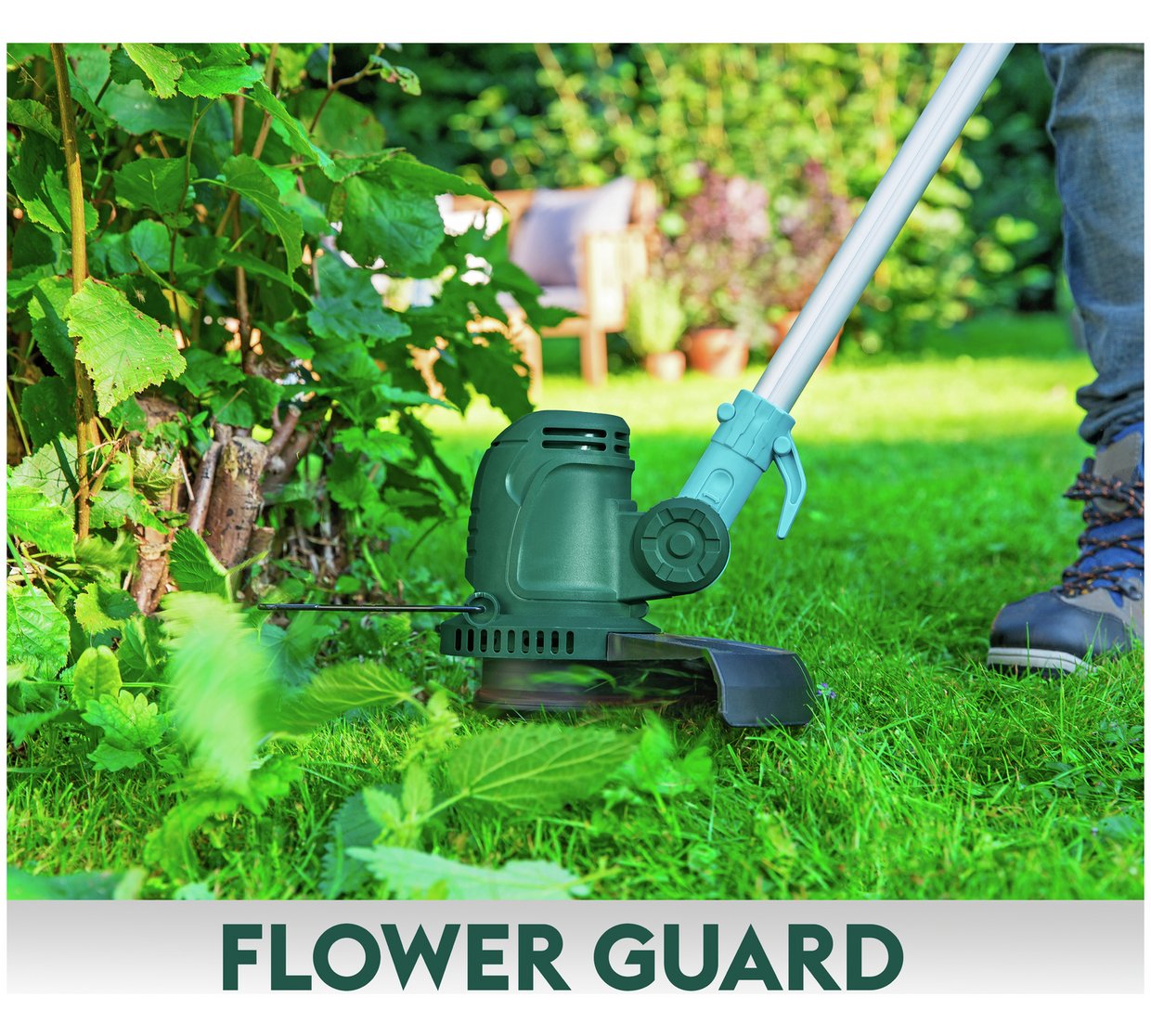 Safety guard and features a plant guard to protect your flowers and plants while trimming the grass.