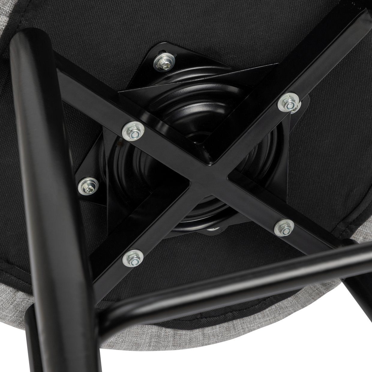 Upholstered in cool grey fabric with plush cushioning and built in footrests on the splayed metal legs.