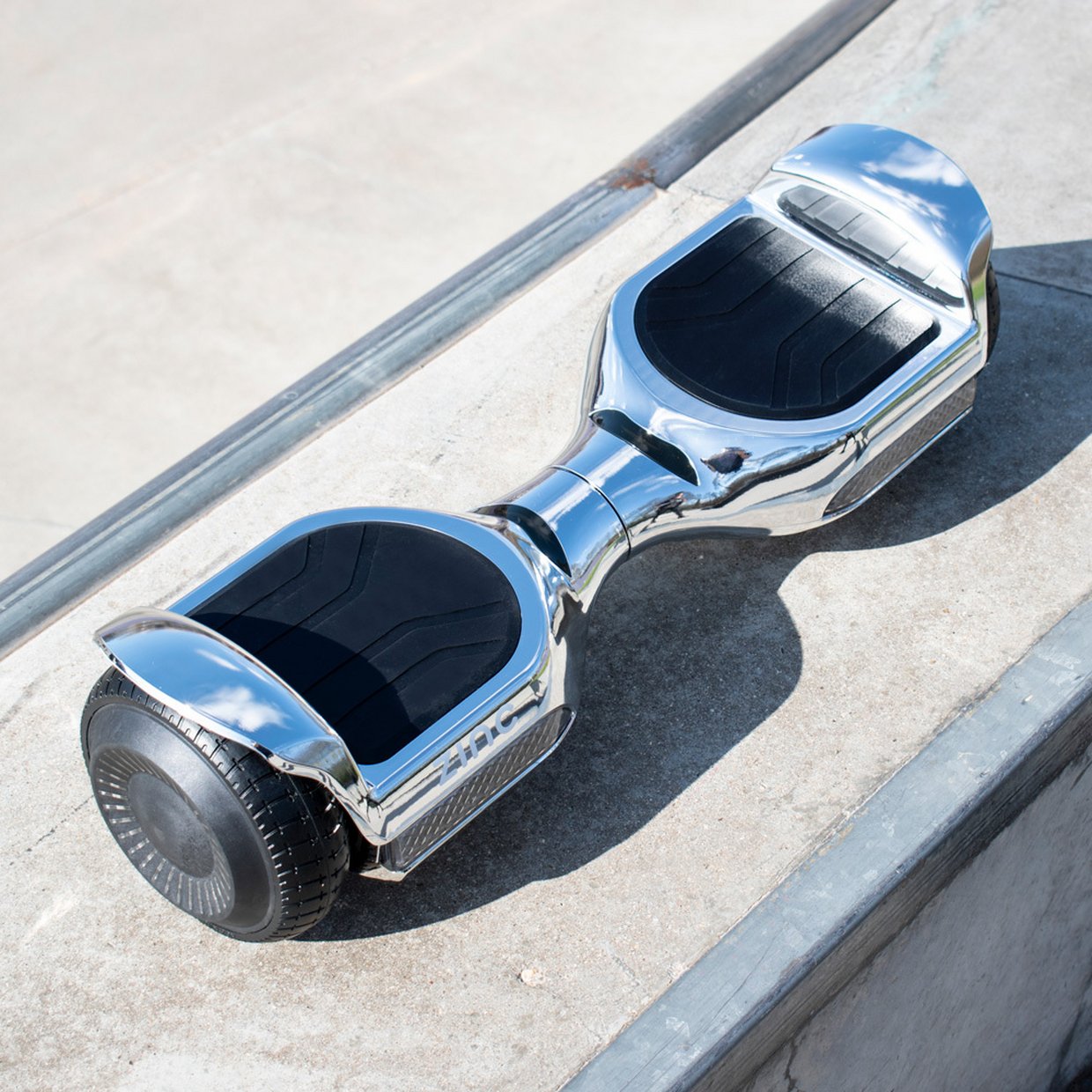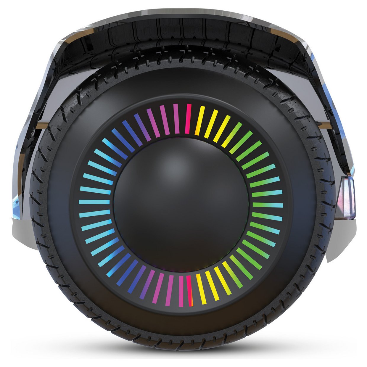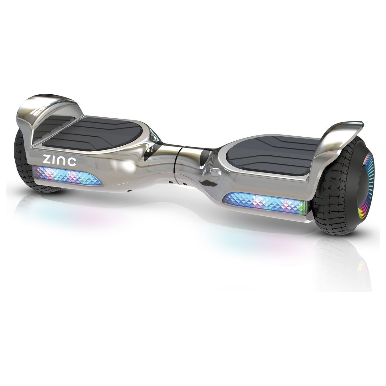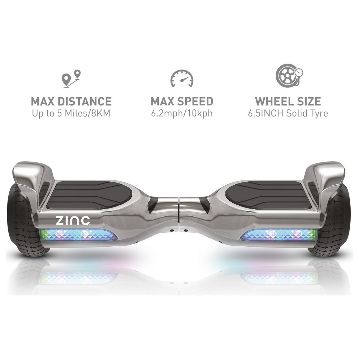 With glowing colourful LED headlights to brighten up your path ahead and 6.5 inch puncture proof multi-coloured LED wheels so the fun never stops. With 2 powerful 120W motors you can travel easily up hills ( hill climb capability of 8 degrees incline). Achieving top speeds of 6mph and a max distance of 5 miles on just one charge, you will have plenty of fun with family and friends on your Zinc Megastar. This hoverboard even allows for wireless connection so that you can play music through your hoverboard!
