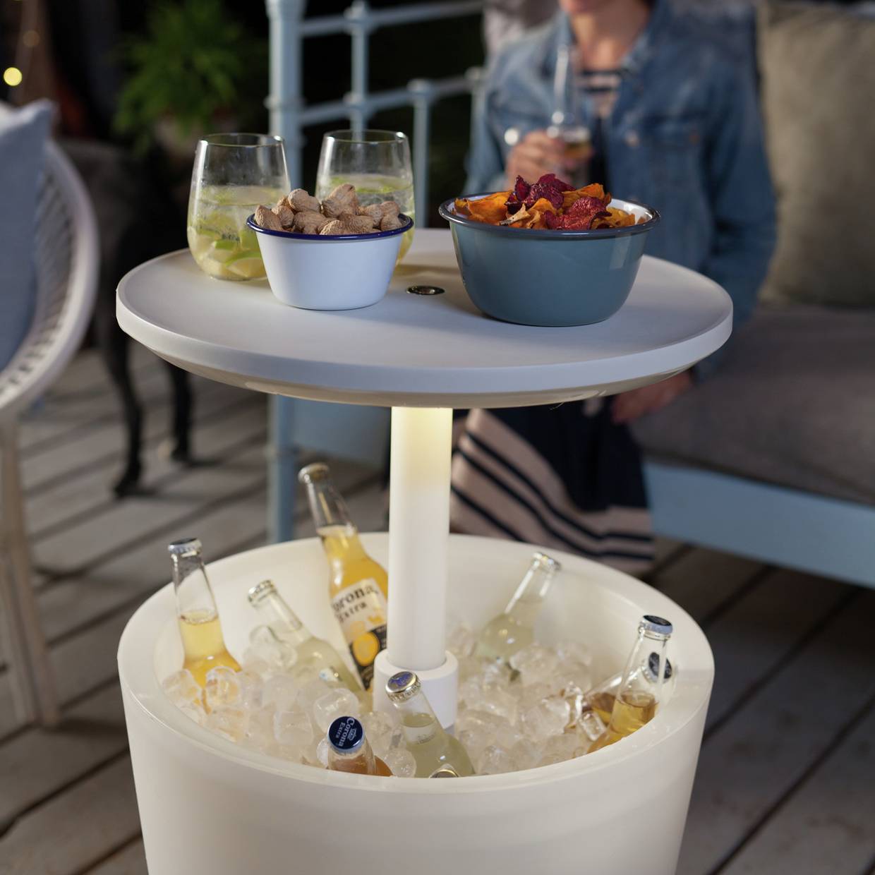 Multi-purpose outdoor furniture, serving as a cocktail table, coffee table and drinks cooler in one.