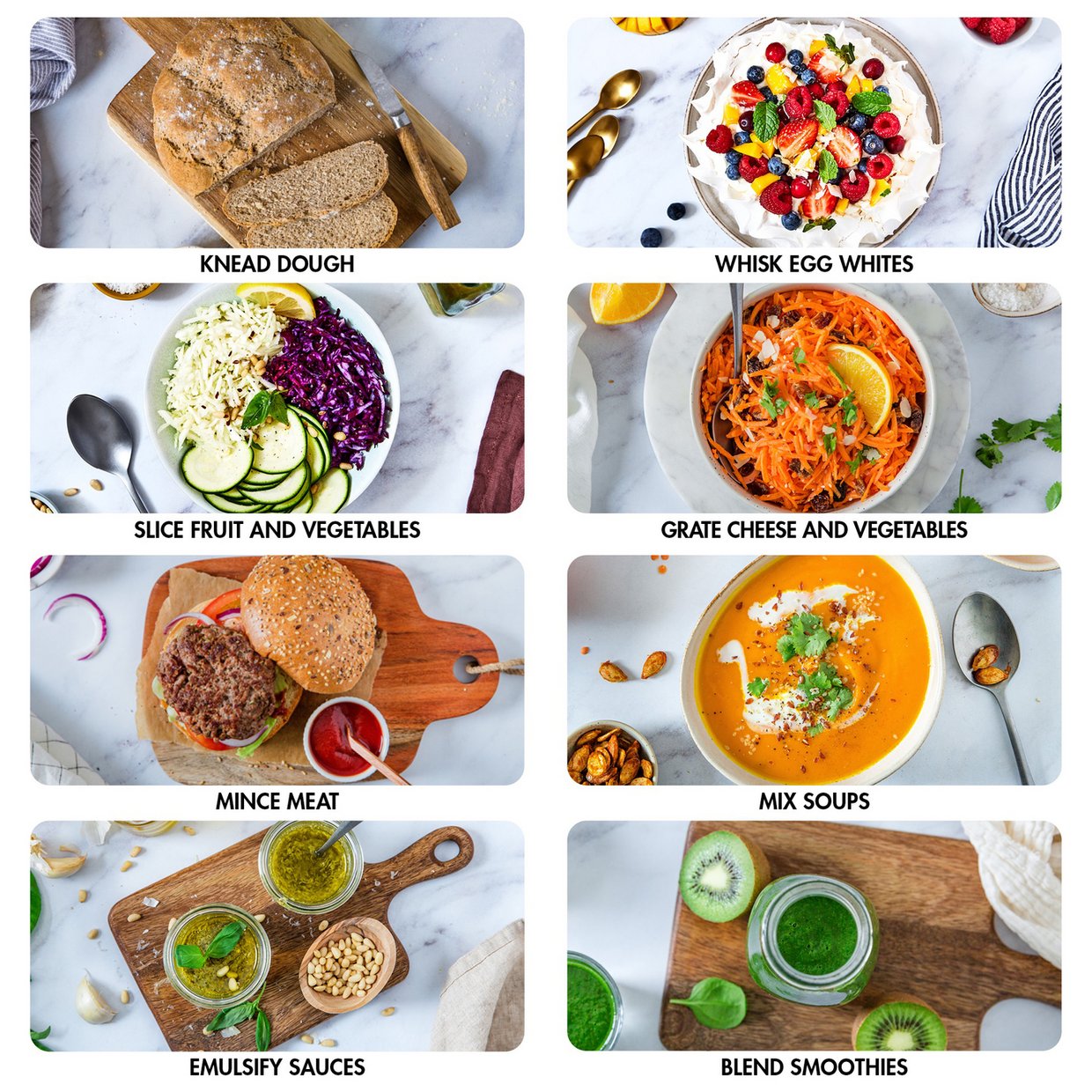 Slices, grates, whisks, ice crushing function, kneads dough.