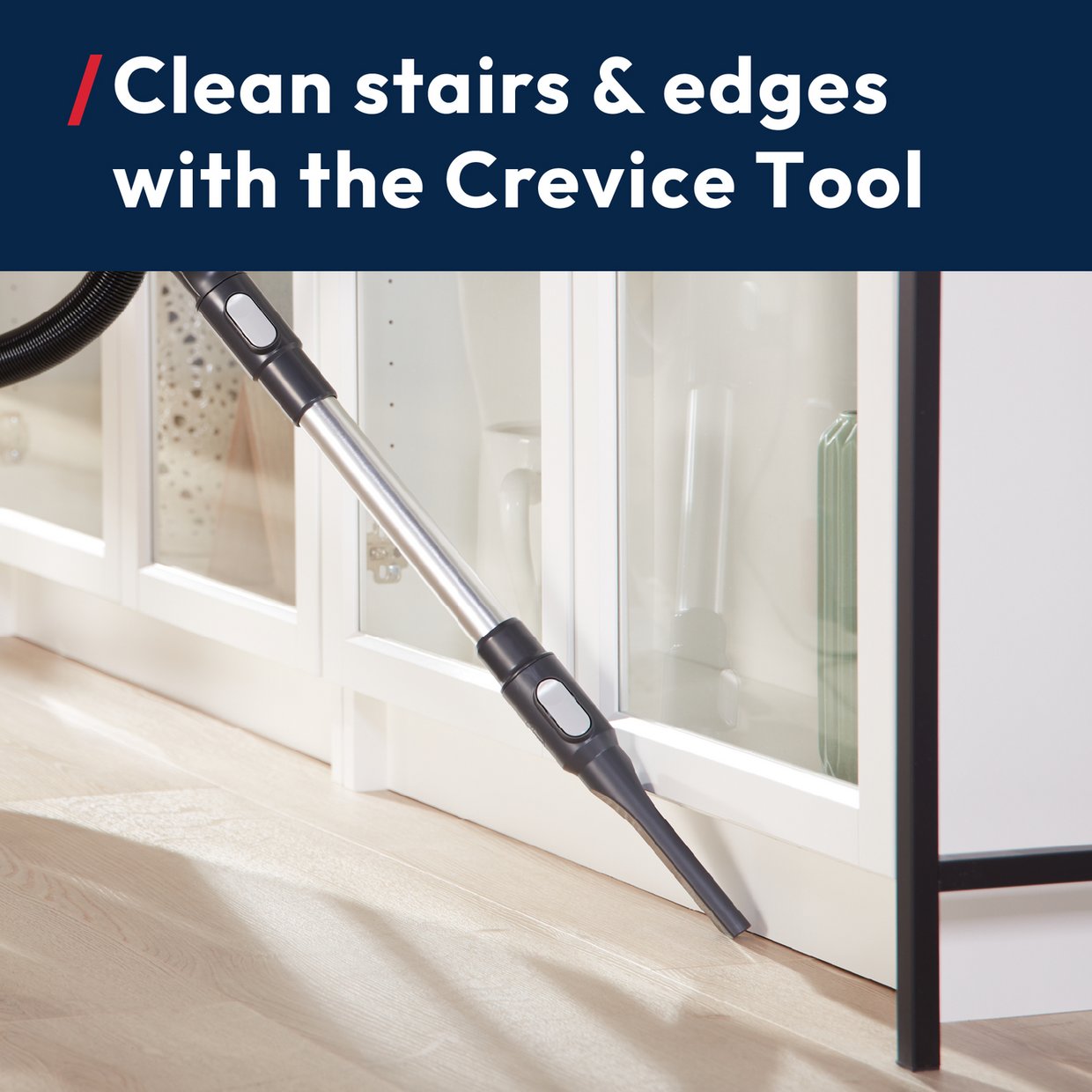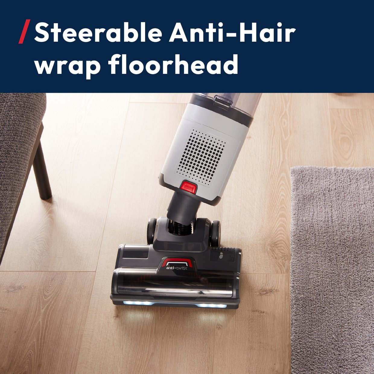 CONSISTENT POWERFUL CLEANING ALL AROUND YOUR HOME. Deep clean carpets and hard floors using the combination floorhead with anti-hairwrap brushbar. No loss of suction* ensures consistent great performance, even when the dustbin is nearly full.